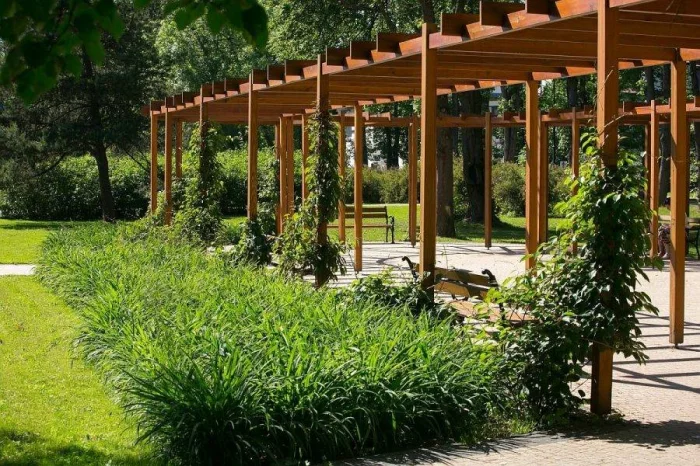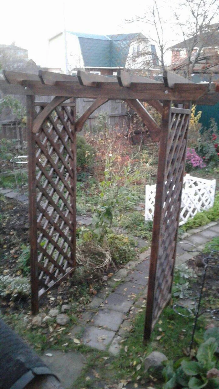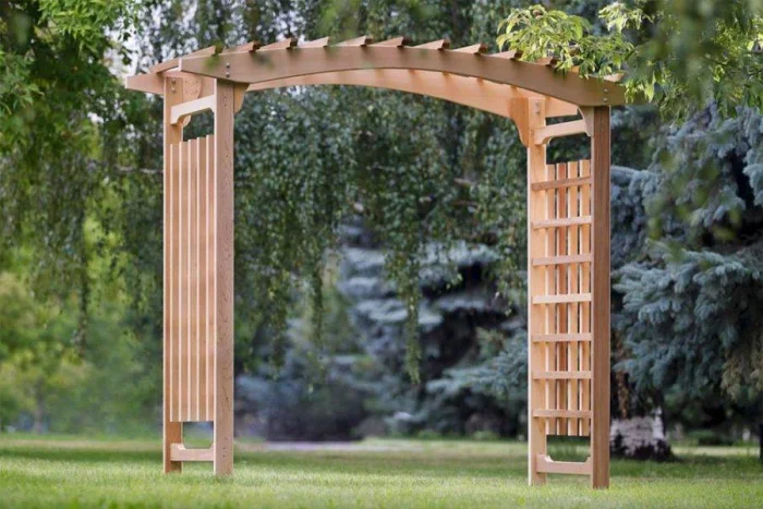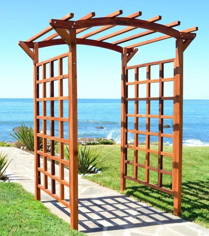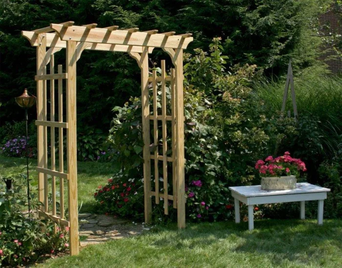 В последнем случае форма может быть не только квадратной, но и треугольной. А «коридор» — это, по сути, длинный навес над тропинкой. В любом случае, это готовая опора для винограда, роз или клематисов. И это, между прочим, тоже её важная функция — украшать ландшафт.