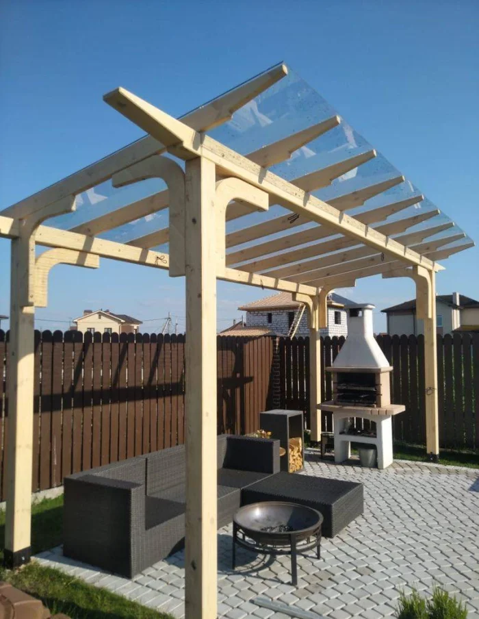 Хотя, будем честны, её истинное призвание — тёплый сезон. Под такой решётчатой крышей приятно прятаться от зноя, а если натянуть тент или брезент — то и от внезапного дождика. Конструкция лёгкая, вес держат вертикальные опорные столбы, обшитые рейками и соединённые сверху балками. Ничего лишнего.
