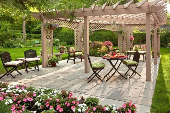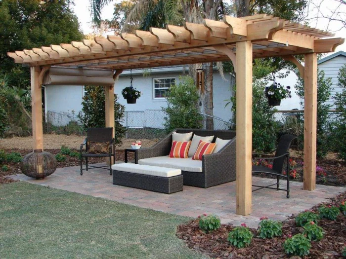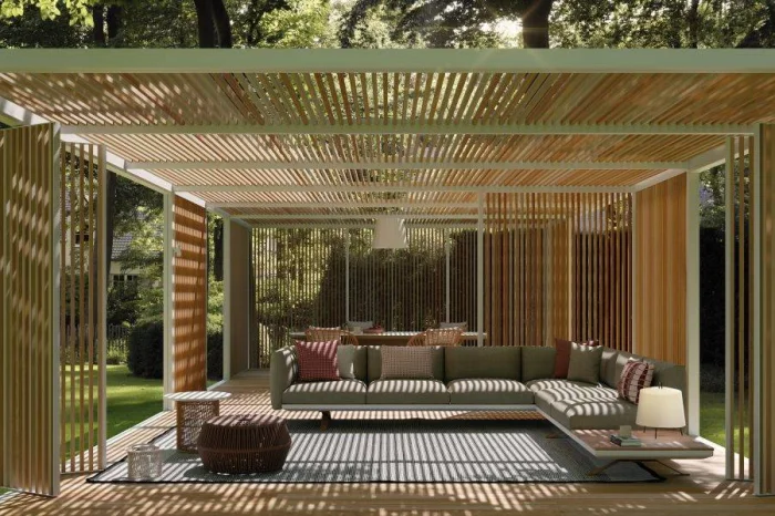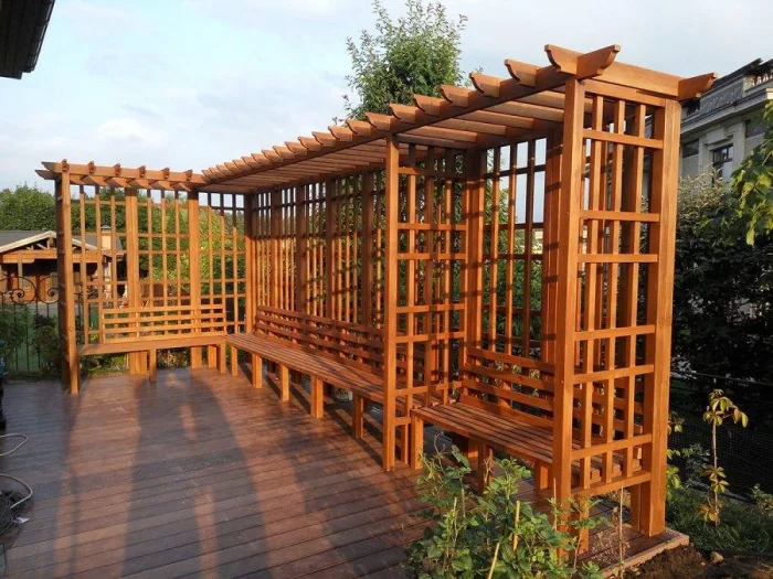 Представьте себе полуоткрытую беседку со стенами и крышей в виде решётки. Вот это и есть пергола. Она отлично спасает от солнца, создаёт уют, но от сильного дождя или ветра, конечно, не защитит. Летний вариант, не более.
