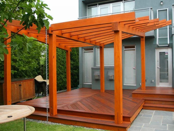 Меньше всего деформируется клееный брус. Но для такой лёгкой постройки, как пергола, часто хватает и качественного обычного бруска.