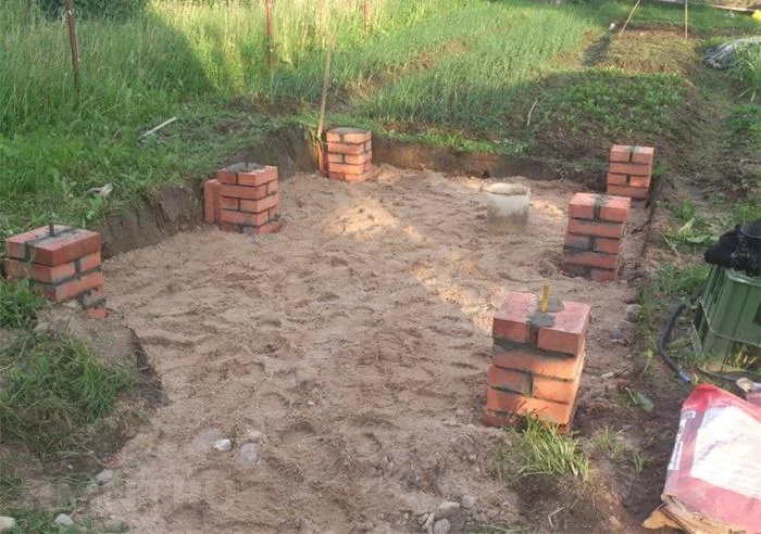Можно сделать и кирпичные столбики. После заливки бетонного основания (но чаще и ближе друг к другу, через метр), на него кладется раствор, и выводится столбик в два кирпича. Каждый новый ряд кладется перпендикулярно предыдущему. Высота — около 20 см над землей. Надежно и солидно.