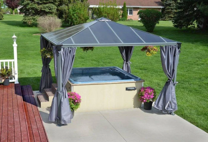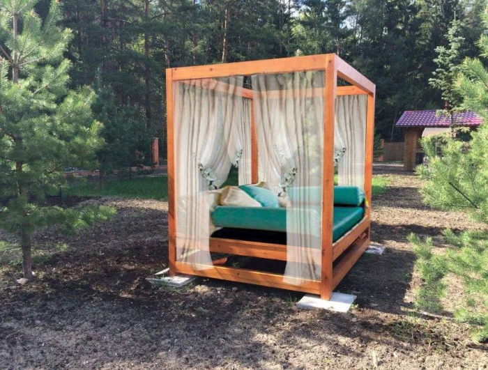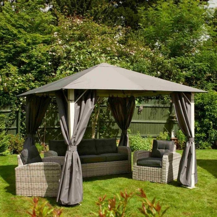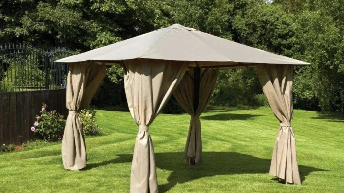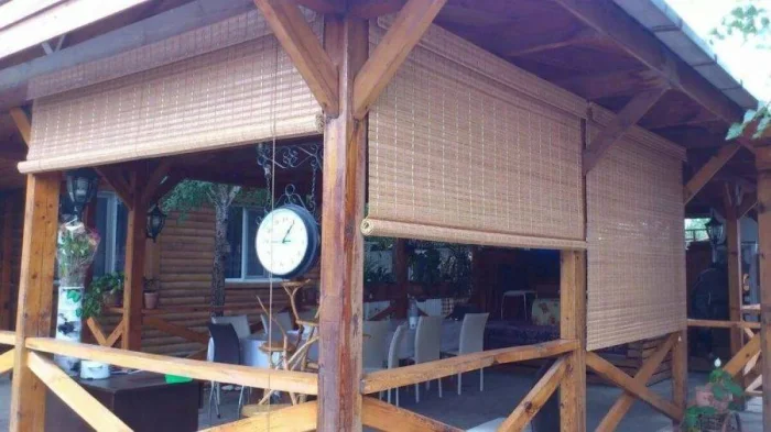 Если в вашем регионе погода любит сюрпризы, присмотритесь к шторам из поливинилхлорида. Это броня против ливня и ветра. Они бывают прозрачными (чтобы не закрывать вид), цветными, с рисунком. Но есть и оборотная сторона медали: они почти не «дышат». В беседке с плотно застёгнутыми ПВХ-шторами может стать душно, поэтому о проветривании стоит подумать заранее.
