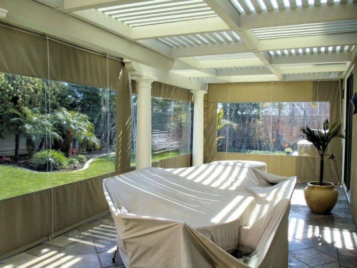 Хотите больше практичности? Обратите внимание на акрил. Эти шторы легко моются, не боятся воды и отлично справляются с солнцем, дождём и насекомыми. Есть один нюанс: воздух они пропускают плохо. Летом это может быть минусом, зато в прохладный сезон превращается в огромный плюс. Представьте: опустили полотна, включили тепловентилятор — и вот у вас уже тёплая, уютная капсула, в которой не страшна никакая осенняя сырость.