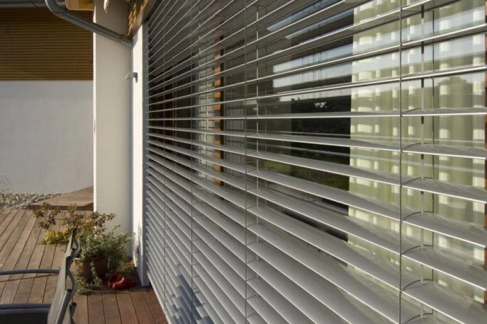 Это уже не ткань, а основательные деревянные или металлические жалюзи, которые крепят снаружи. Они отлично защищают от солнца и даже немного приглушают уличный шум. Конструкция планок продумана так, чтобы вода не задерживалась, а стекала вниз. Дерево, конечно, пропитывают защитным составом, а металл используют нержавеющий.